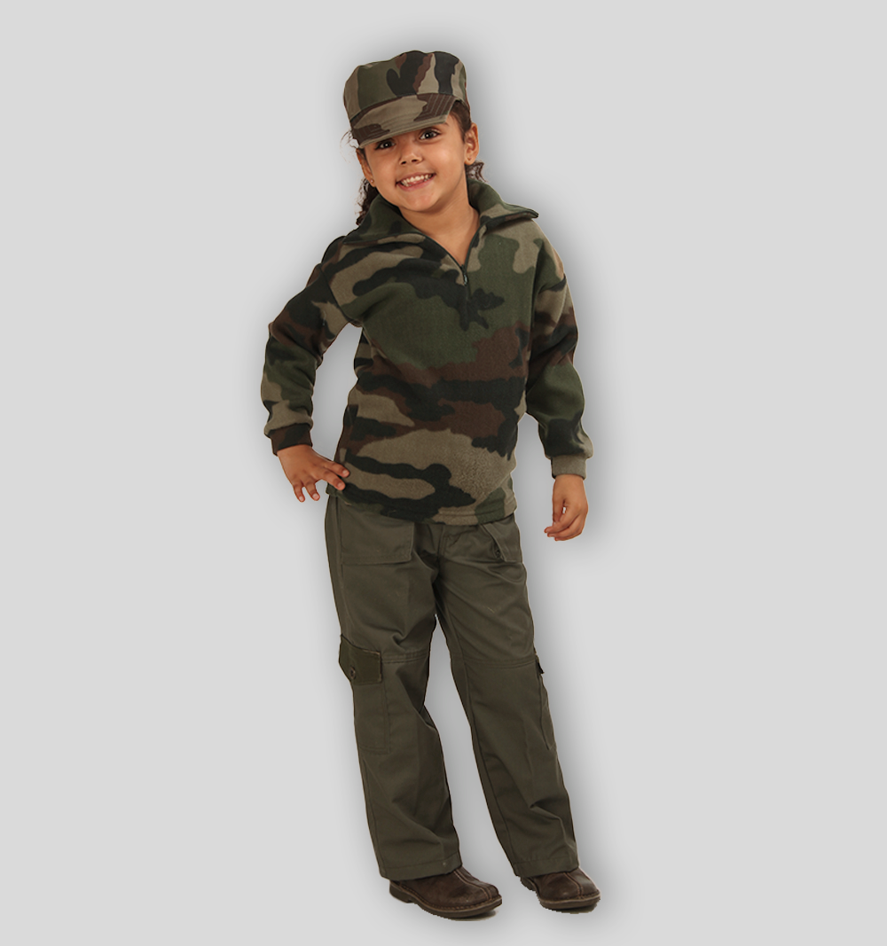 Cette Chemise Polaire existe en 3 couleurs : motifs camouflage, kaki ou noir. Elle se porte facilement avec les autres vêtements de la gamme Militaire Enfant.