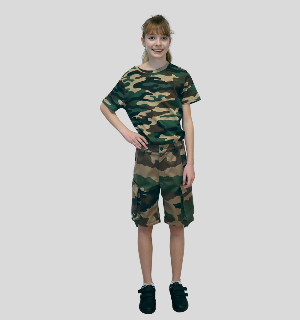 Ce Bermuda pour Enfant s’inspire du modèle de Bermuda Militaire de l’Armée Française. Fabriqué dans un tissu à motifs Camouflage CE chevron en coton et polyester, il garantit Durabilité, Confort et Facilité d’Entretien. Ce Bermuda est équipé d’une ceinture élastiquée, de 4 poches (dont 2 sur les cuisses) et d’une fermeture par bouton et braguette zippée. Ce Bermuda est un modèle mixte convenant aussi bien aux Garçons qu’aux Filles.